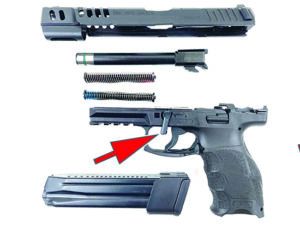 Field-stripping the HK VP9 Match is easily accomplished by rotating the takedown lever when the slide is locked back, removing the slide from the frame, and taking the rest of the parts off.